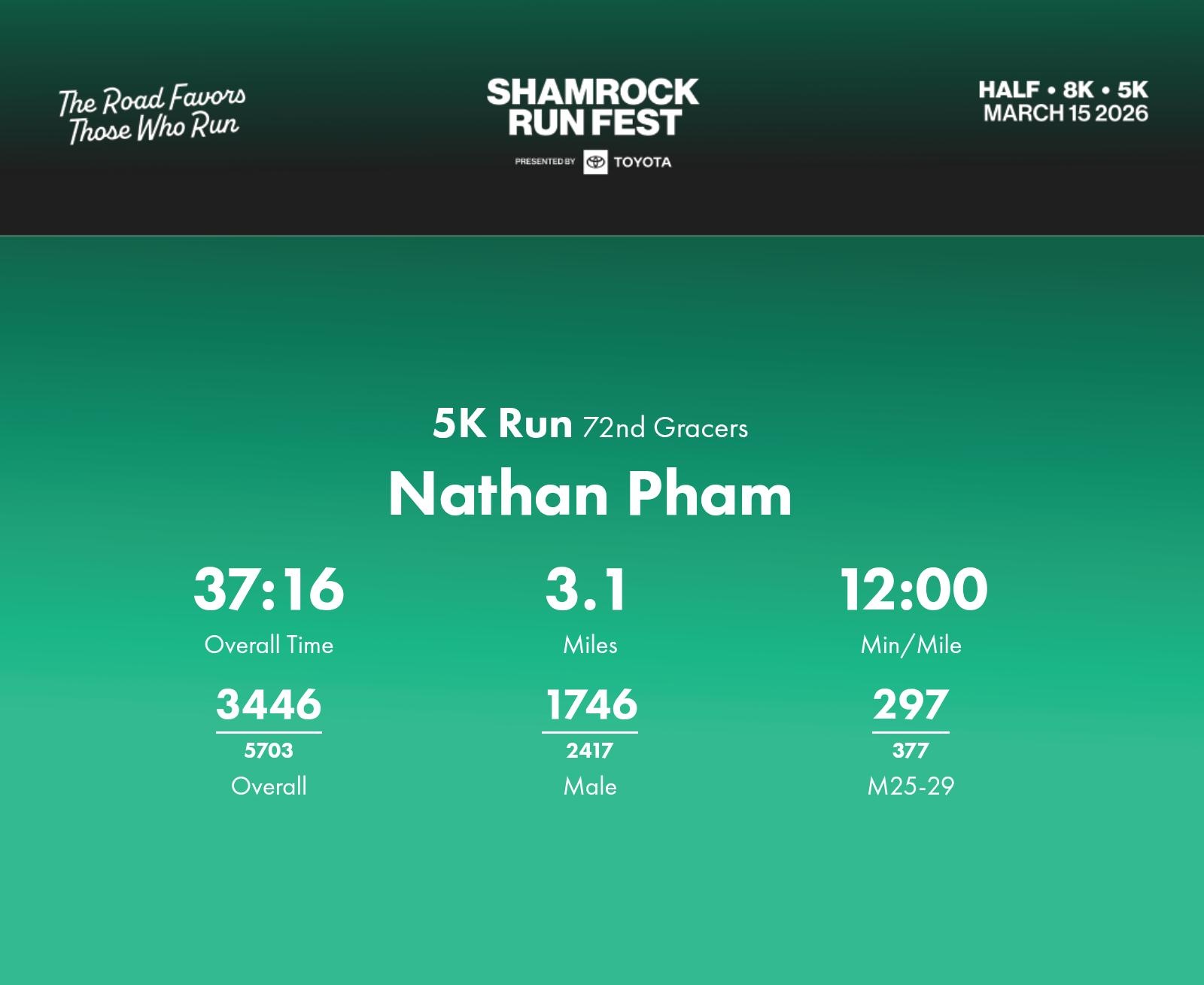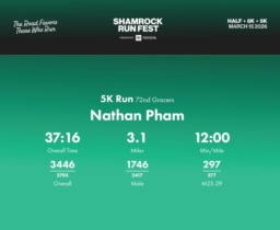 Date: March 15, 2026 Participant: Nathan Pham #46630 Race: 2026 Shamrock Run Fest presented by Toyota 5K Run Distance: 3.1 miles