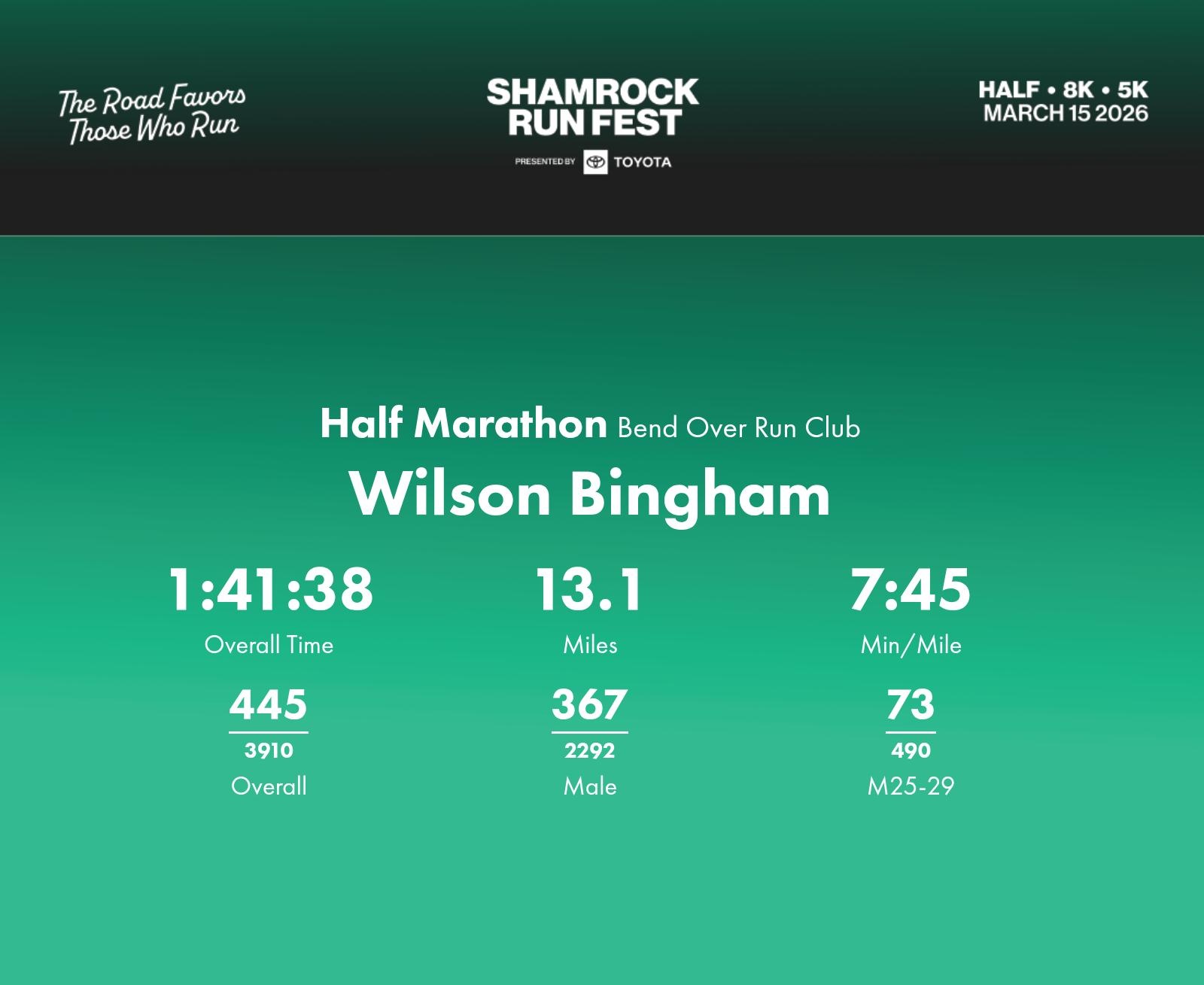Date: March 15, 2026 Participant: Wilson Bingham #1797 Race: 2026 Shamrock Run Fest presented by Toyota Half Marathon Distance: 13.1 miles