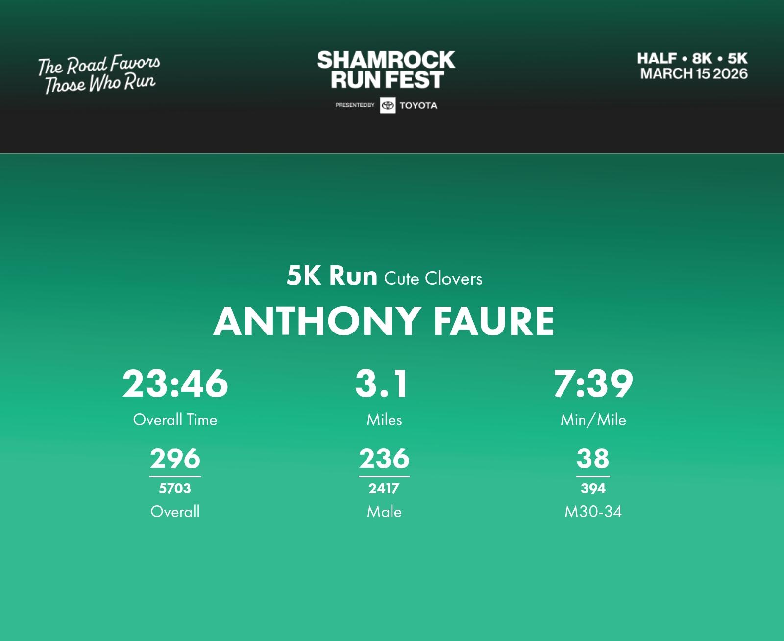 Date: March 15, 2026 Participant: ANTHONY FAURE #40186 Race: 2026 Shamrock Run Fest presented by Toyota 5K Run Distance: 3.1 miles