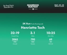 Date: March 15, 2026 Participant: Henrietta Toch #40545 Race: 2026 Shamrock Run Fest presented by Toyota 5K Run Distance: 3.1 miles