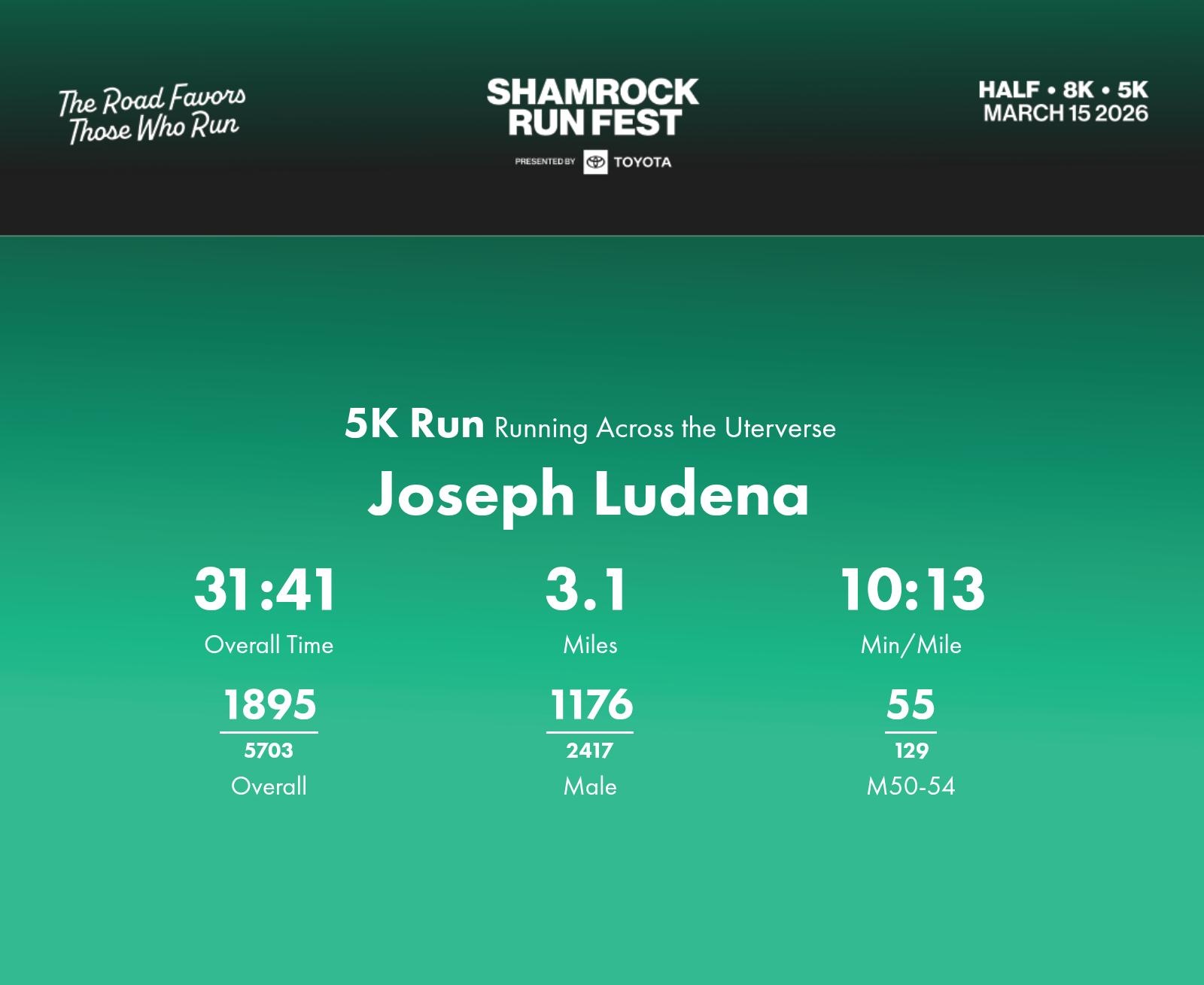 Date: March 15, 2026 Participant: Joseph Ludena #40688 Race: 2026 Shamrock Run Fest presented by Toyota 5K Run Distance: 3.1 miles