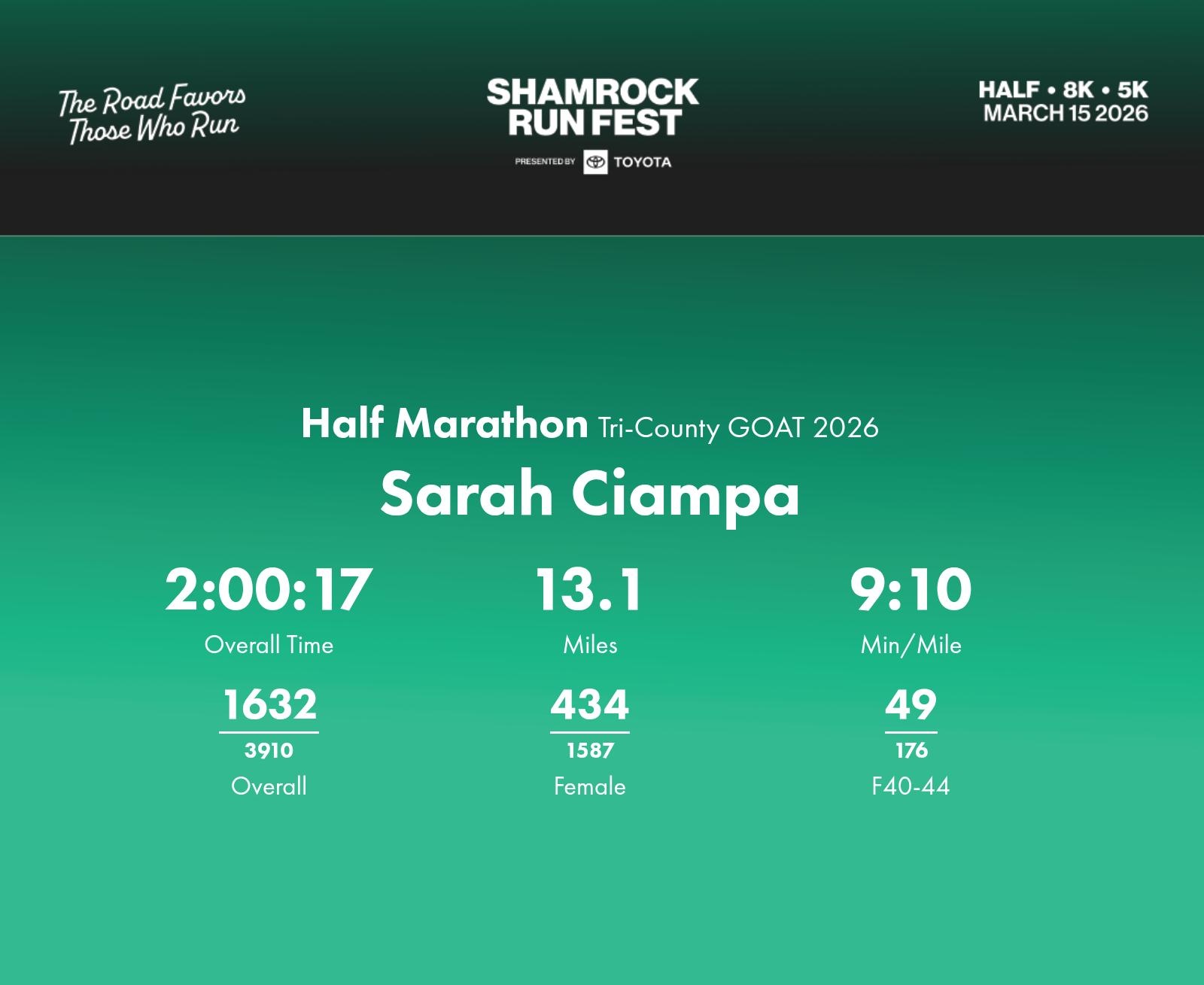 Date: March 15, 2026 Participant: Sarah Ciampa #1629 Race: 2026 Shamrock Run Fest presented by Toyota Half Marathon Distance: 13.1 miles