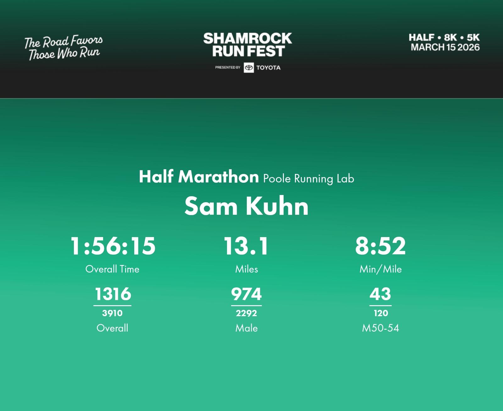 Date: March 15, 2026 Participant: Sam Kuhn #1354 Race: 2026 Shamrock Run Fest presented by Toyota Half Marathon Distance: 13.1 miles