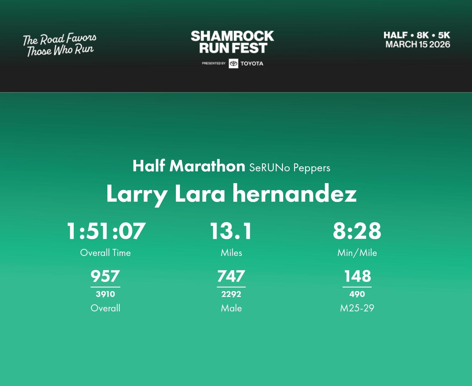 Date: March 15, 2026 Participant: Larry Lara hernandez #1516 Race: 2026 Shamrock Run Fest presented by Toyota Half Marathon Distance: 13.1 miles