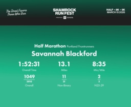 Date: March 15, 2026 Participant: Savannah Blackford #5259 Race: 2026 Shamrock Run Fest presented by Toyota Half Marathon Distance: 13.1 miles