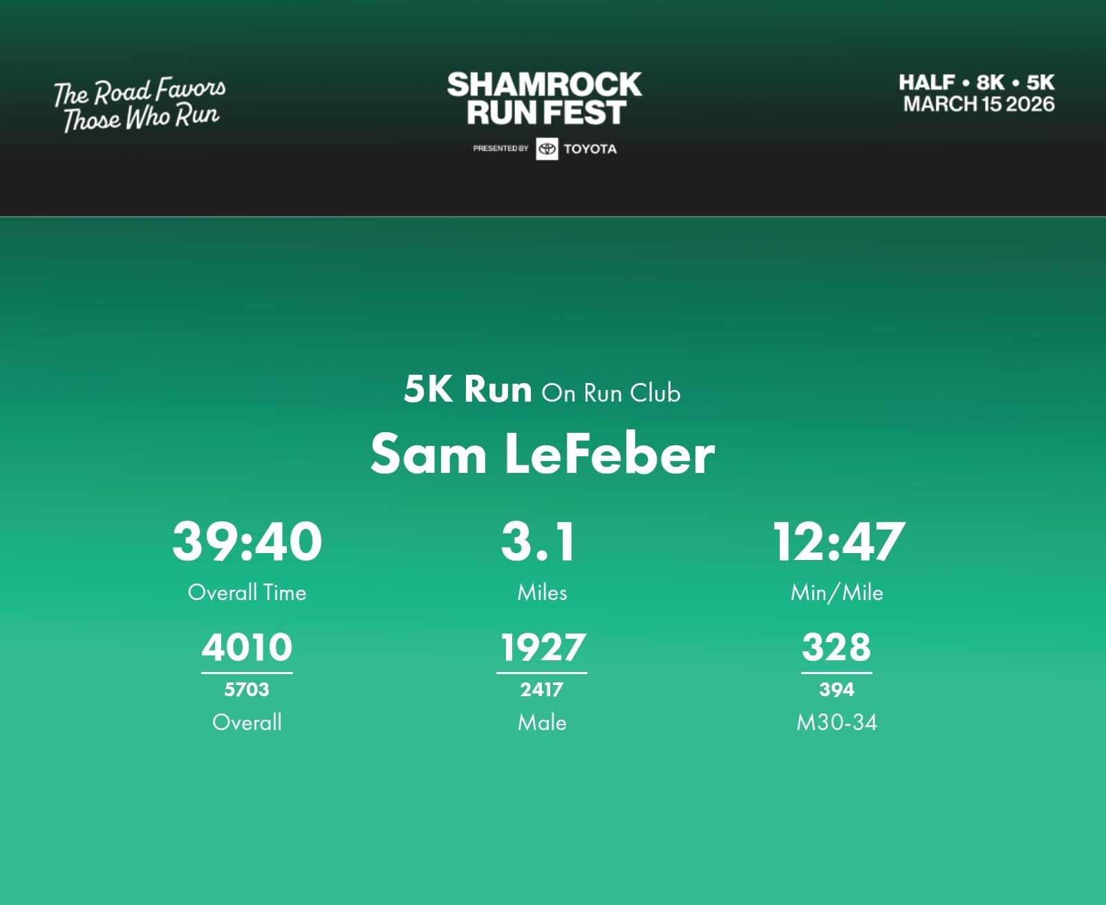 Date: March 15, 2026 Participant: Sam LeFeber #40435 Race: 2026 Shamrock Run Fest presented by Toyota 5K Run Distance: 3.1 miles