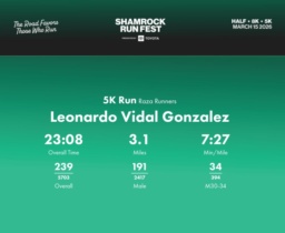 Date: March 15, 2026 Participant: Leonardo Vidal Gonzalez #40620 Race: 2026 Shamrock Run Fest presented by Toyota 5K Run Distance: 3.1 miles