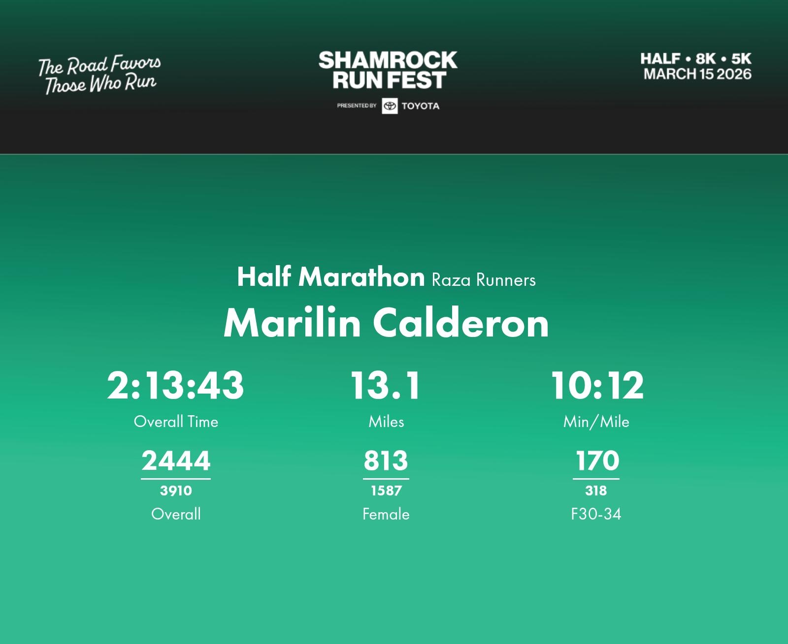 Date: March 15, 2026 Participant: Marilin Calderon #1414 Race: 2026 Shamrock Run Fest presented by Toyota Half Marathon Distance: 13.1 miles