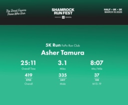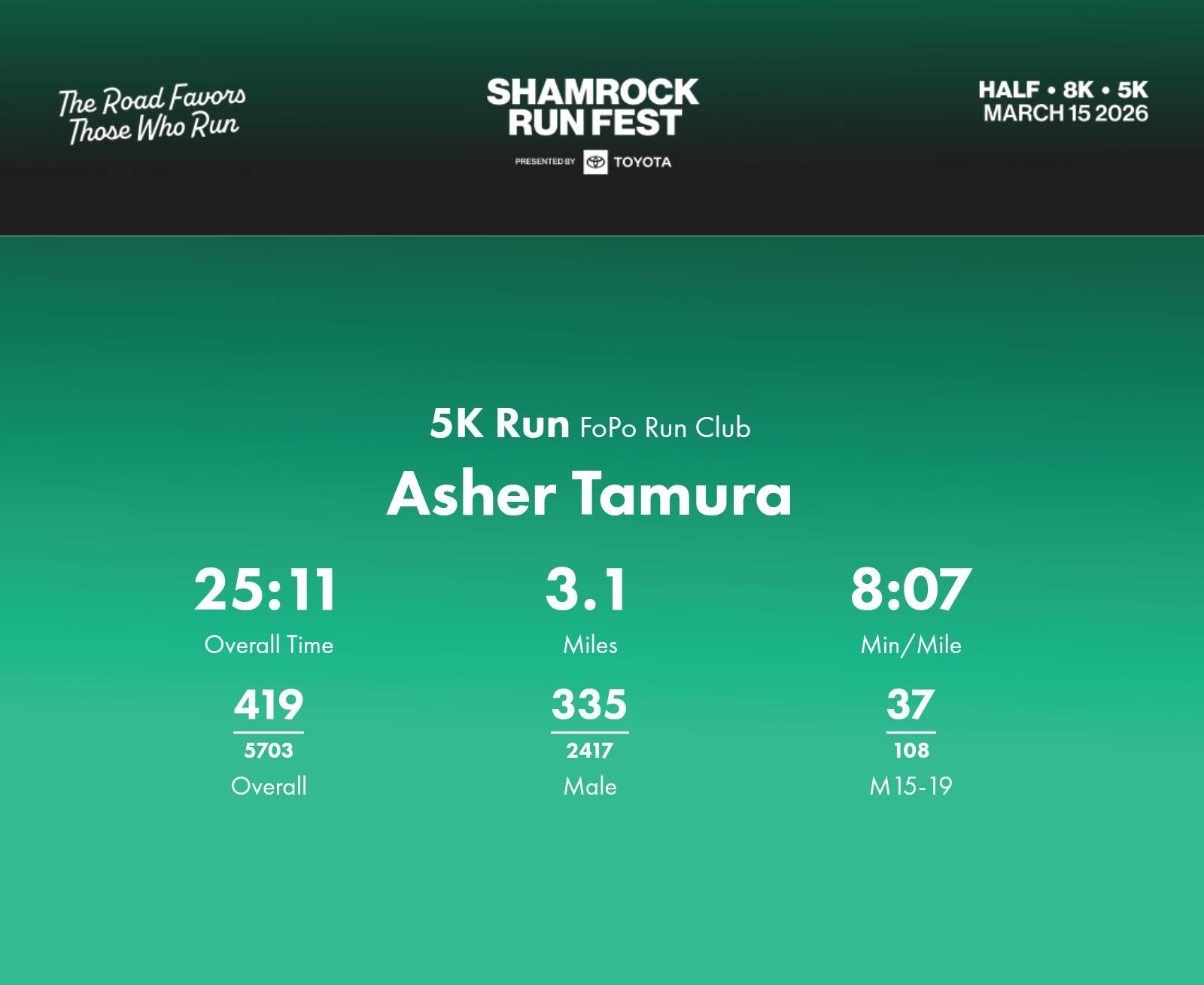 Date: March 15, 2026 Participant: Asher Tamura #40269 Race: 2026 Shamrock Run Fest presented by Toyota 5K Run Distance: 3.1 miles