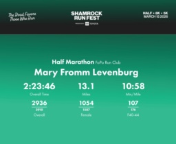 Date: March 15, 2026 Participant: Mary Fromm Levenburg #1176 Race: 2026 Shamrock Run Fest presented by Toyota Half Marathon Distance: 13.1 miles