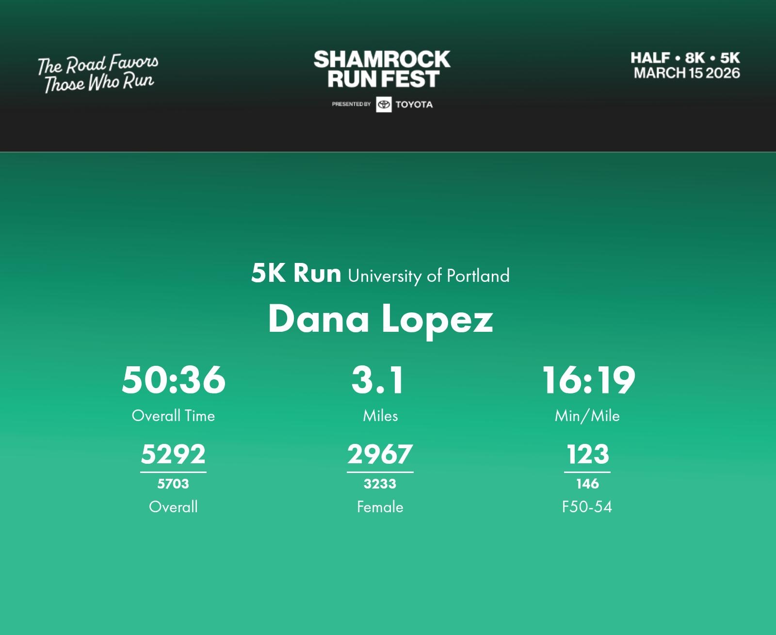 Date: March 15, 2026 Participant: Dana Lopez #40918 Race: 2026 Shamrock Run Fest presented by Toyota 5K Run Distance: 3.1 miles