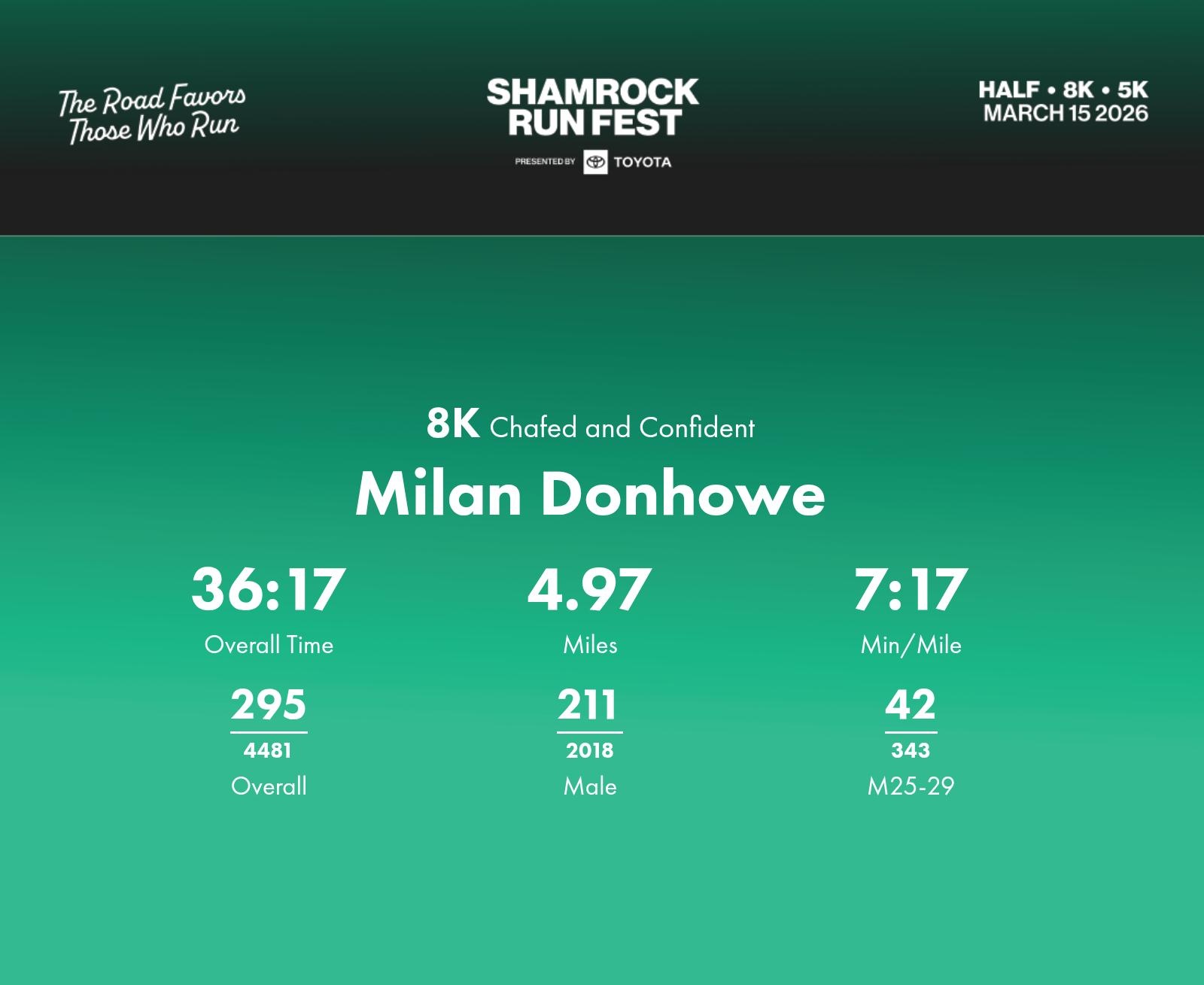 Date: March 15, 2026 Participant: Milan Donhowe #31036 Race: 2026 Shamrock Run Fest presented by Toyota 8K Distance: 5.0 miles