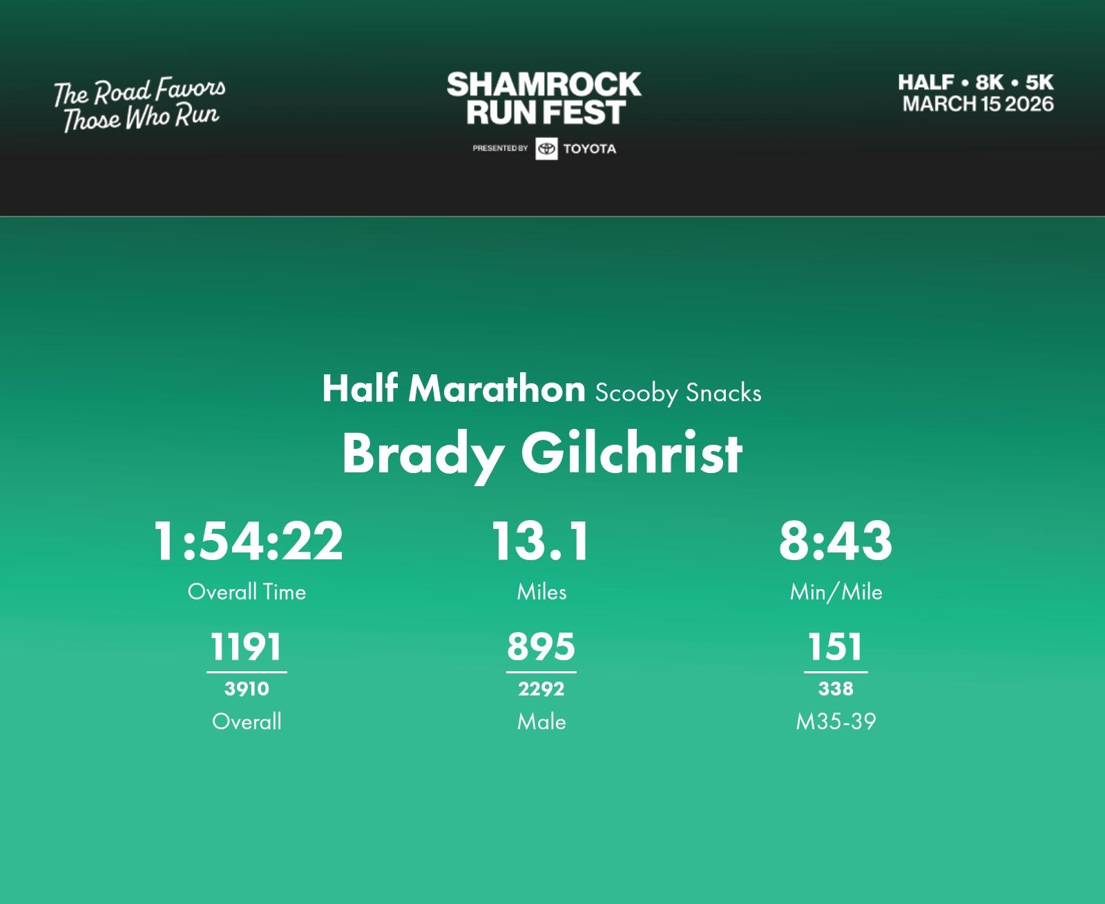 Date: March 15, 2026 Participant: Brady Gilchrist #5459 Race: 2026 Shamrock Run Fest presented by Toyota Half Marathon Distance: 13.1 miles