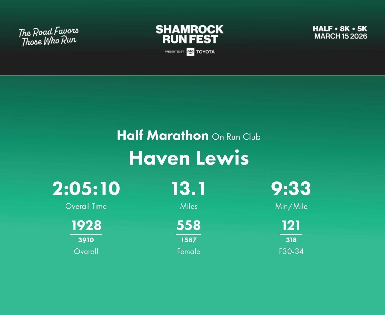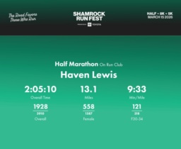 Date: March 15, 2026 Participant: Haven Lewis #1280 Race: 2026 Shamrock Run Fest presented by Toyota Half Marathon Distance: 13.1 miles