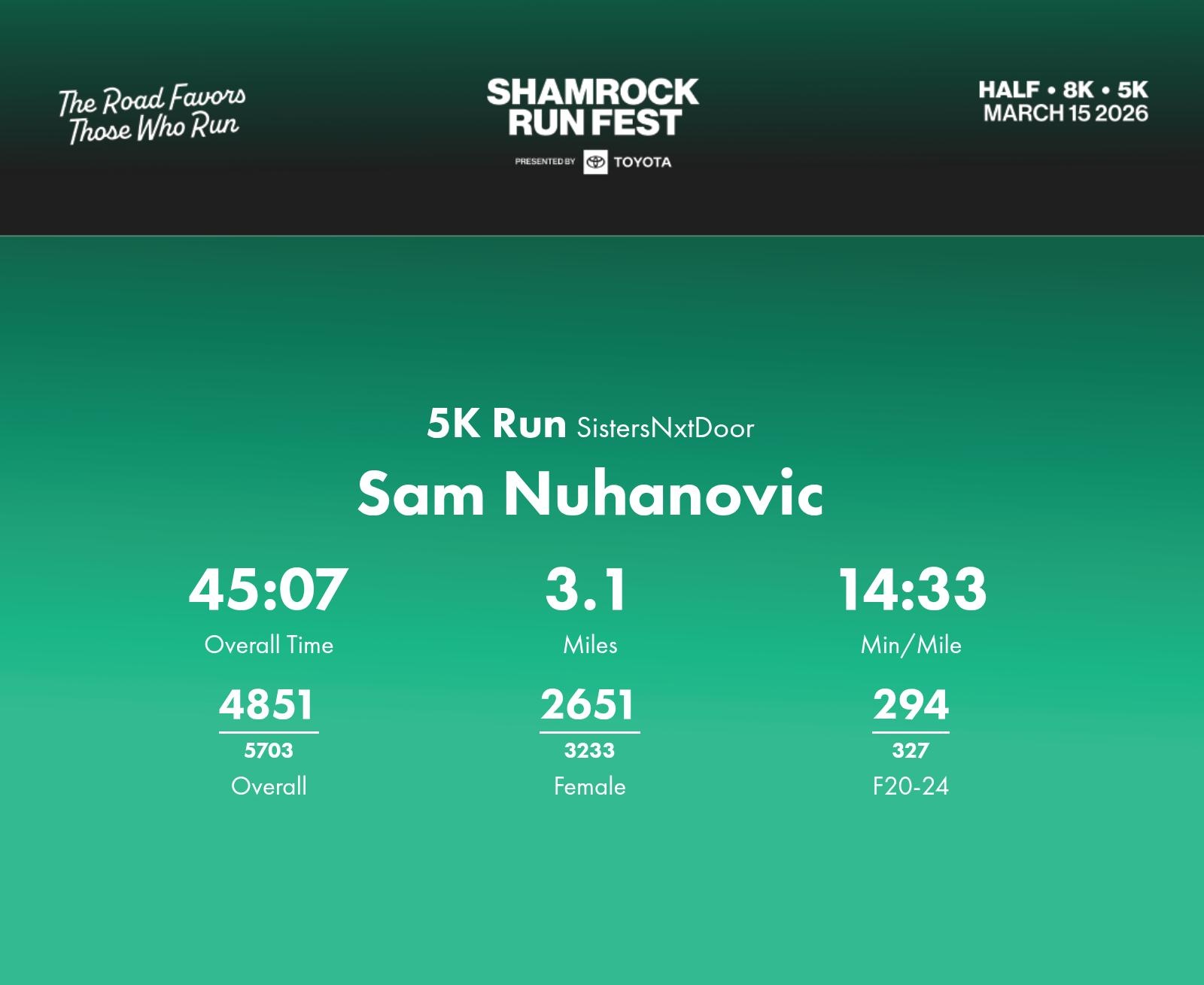 Date: March 15, 2026 Participant: Sam Nuhanovic #46208 Race: 2026 Shamrock Run Fest presented by Toyota 5K Run Distance: 3.1 miles