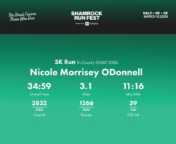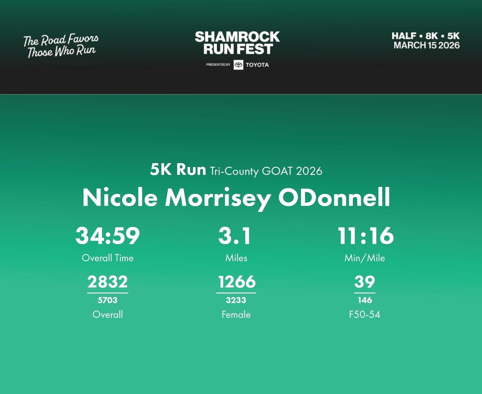 Date: March 15, 2026 Participant: Nicole Morrisey ODonnell #40910 Race: 2026 Shamrock Run Fest presented by Toyota 5K Run Distance: 3.1 miles