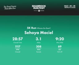 Date: March 15, 2026 Participant: Sehoya Maciel #42754 Race: 2026 Shamrock Run Fest presented by Toyota 5K Run Distance: 3.1 miles