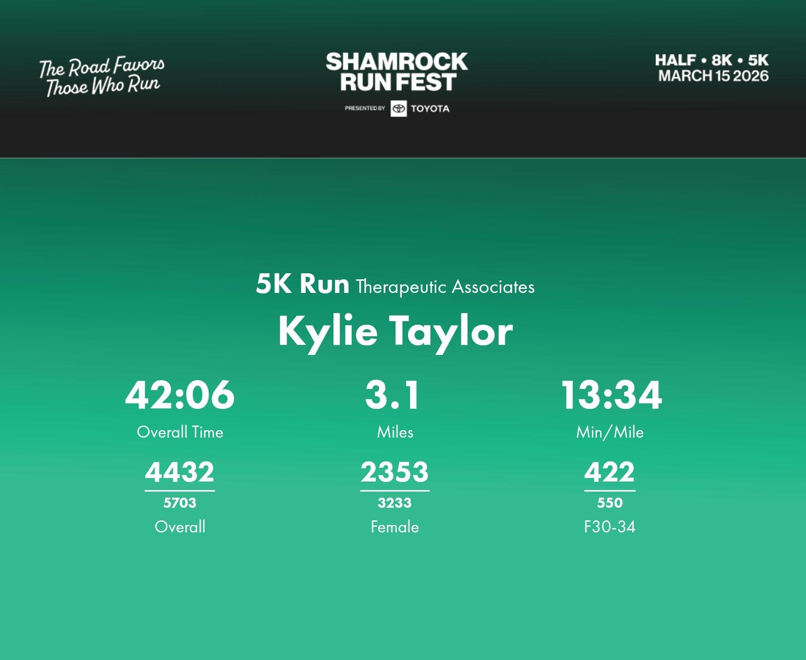 Date: March 15, 2026 Participant: Kylie Taylor #41208 Race: 2026 Shamrock Run Fest presented by Toyota 5K Run Distance: 3.1 miles