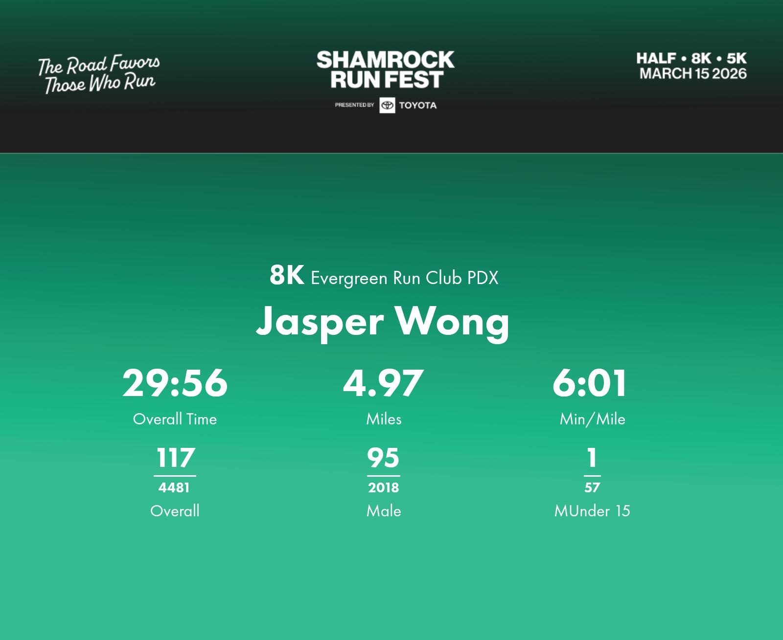 Date: March 15, 2026 Participant: Jasper Wong #30151 Race: 2026 Shamrock Run Fest presented by Toyota 8K Distance: 5.0 miles