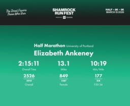 Date: March 15, 2026 Participant: Elizabeth Ankeney #1632 Race: 2026 Shamrock Run Fest presented by Toyota Half Marathon Distance: 13.1 miles