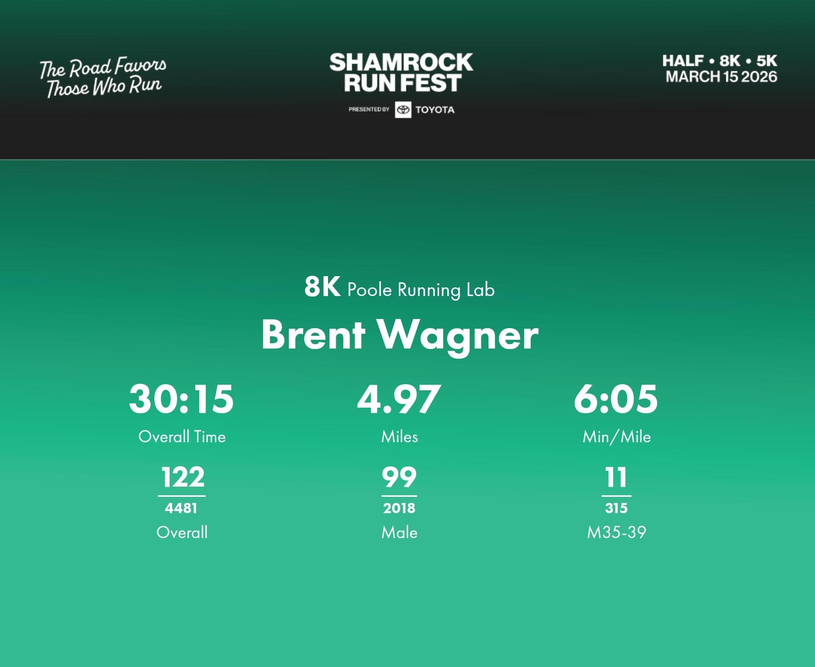Date: March 15, 2026 Participant: Brent Wagner #30463 Race: 2026 Shamrock Run Fest presented by Toyota 8K Distance: 5.0 miles