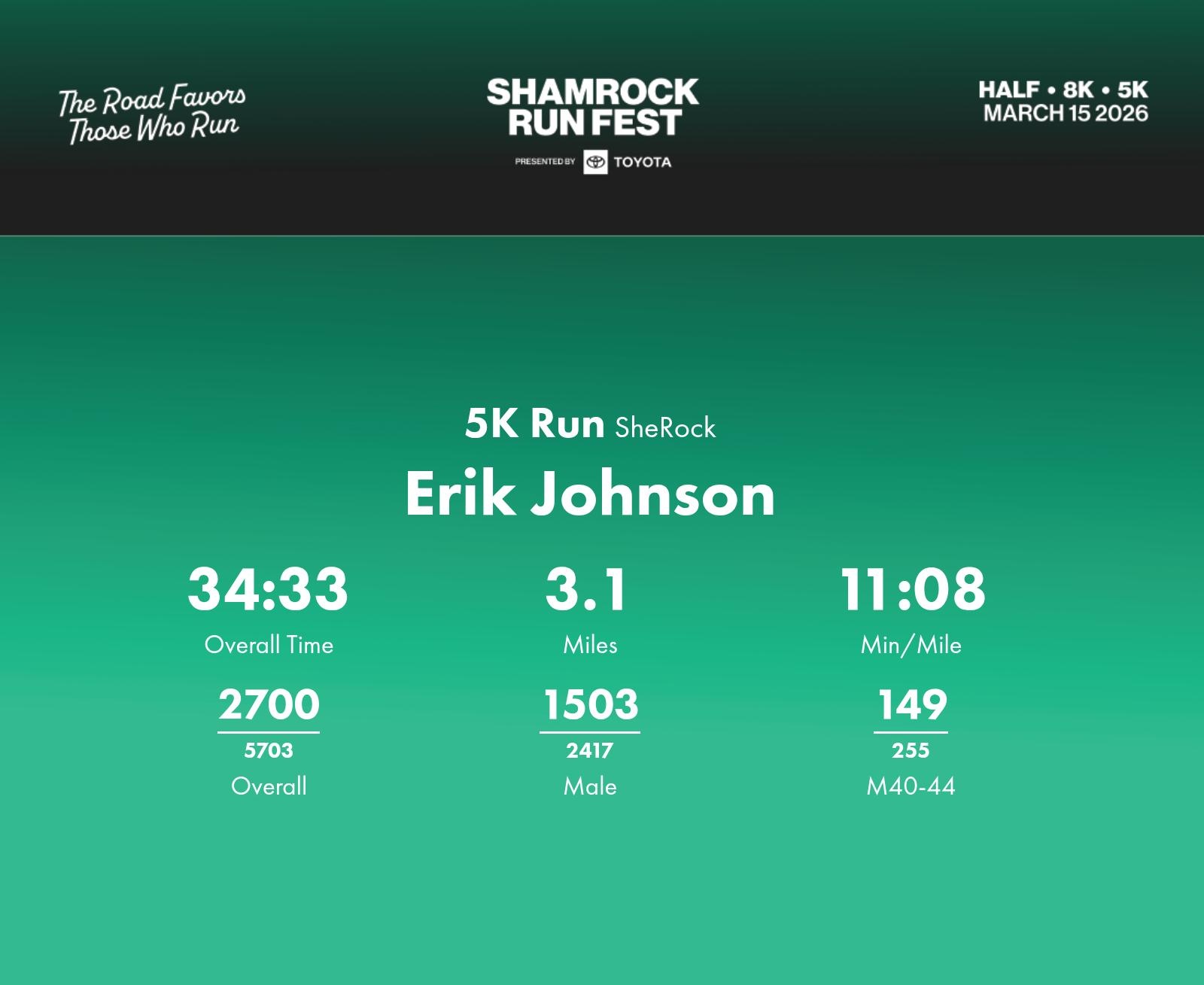 Date: March 15, 2026 Participant: Erik Johnson #40730 Race: 2026 Shamrock Run Fest presented by Toyota 5K Run Distance: 3.1 miles