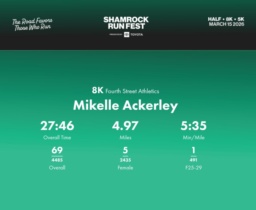Date: March 15, 2026 Participant: Mikelle Ackerley #33734 Race: 2026 Shamrock Run Fest presented by Toyota 8K Distance: 5.0 miles