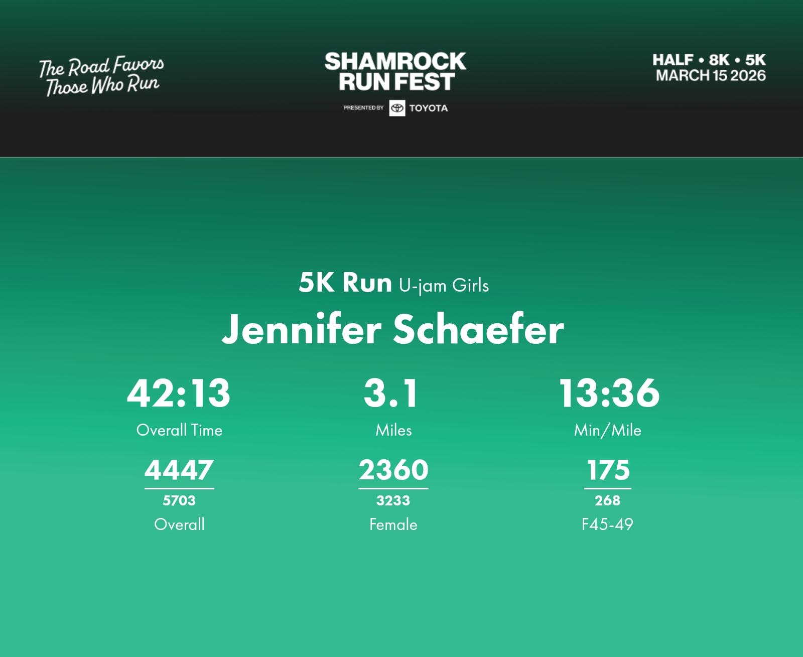 Date: March 15, 2026 Participant: Jennifer Schaefer #42113 Race: 2026 Shamrock Run Fest presented by Toyota 5K Run Distance: 3.1 miles