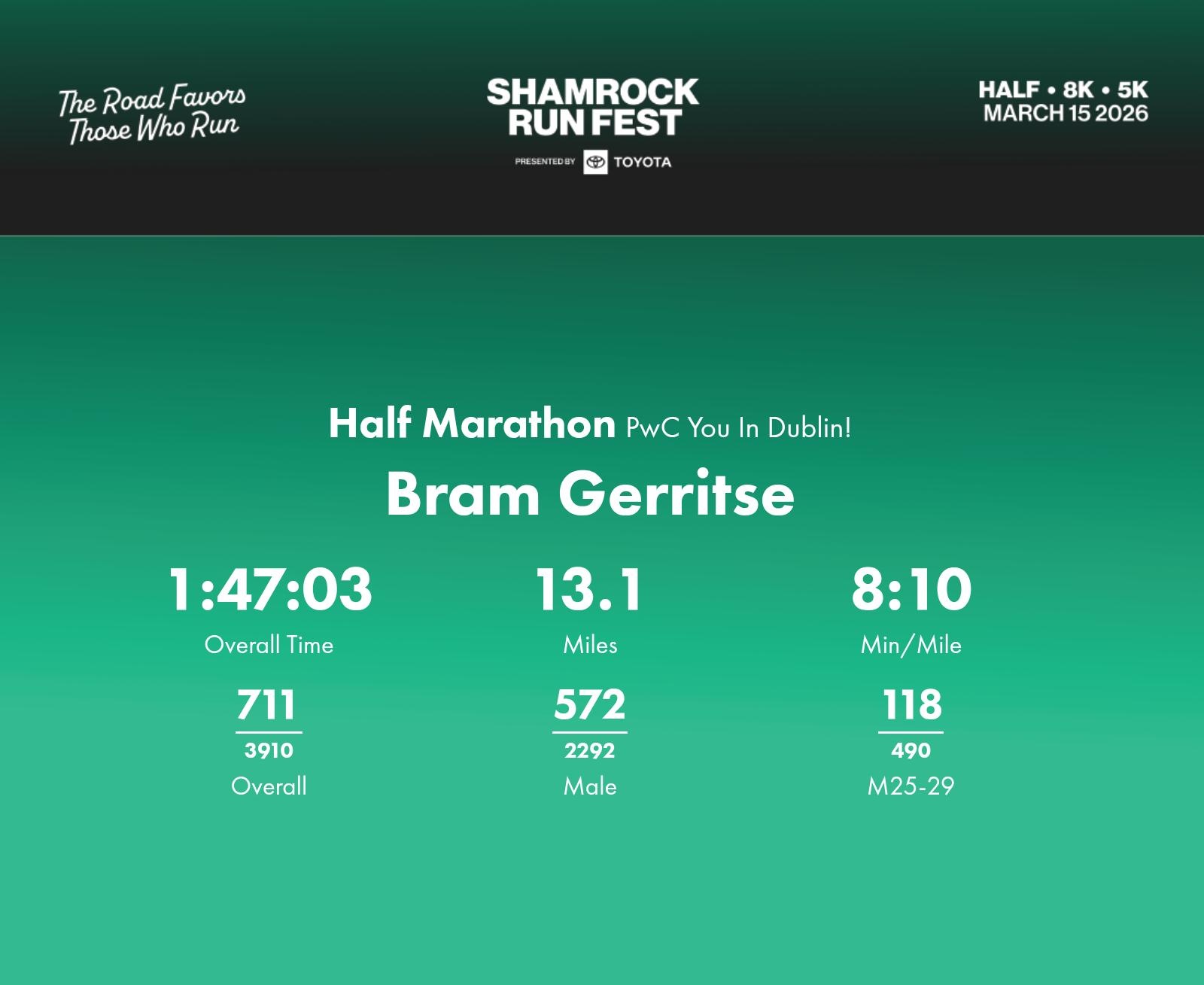 Date: March 15, 2026 Participant: Bram Gerritse #3169 Race: 2026 Shamrock Run Fest presented by Toyota Half Marathon Distance: 13.1 miles