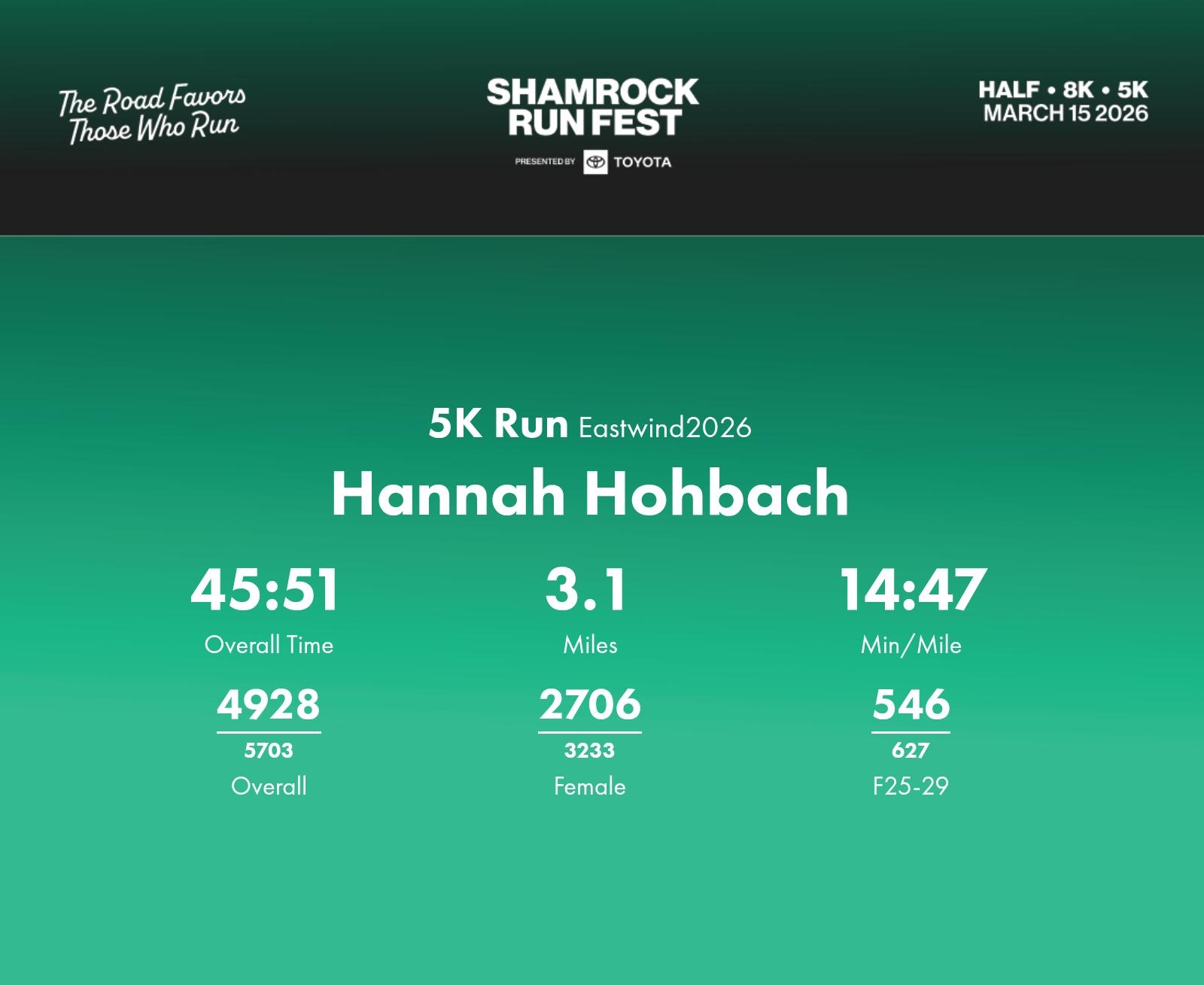 Date: March 15, 2026 Participant: Hannah Hohbach #40217 Race: 2026 Shamrock Run Fest presented by Toyota 5K Run Distance: 3.1 miles