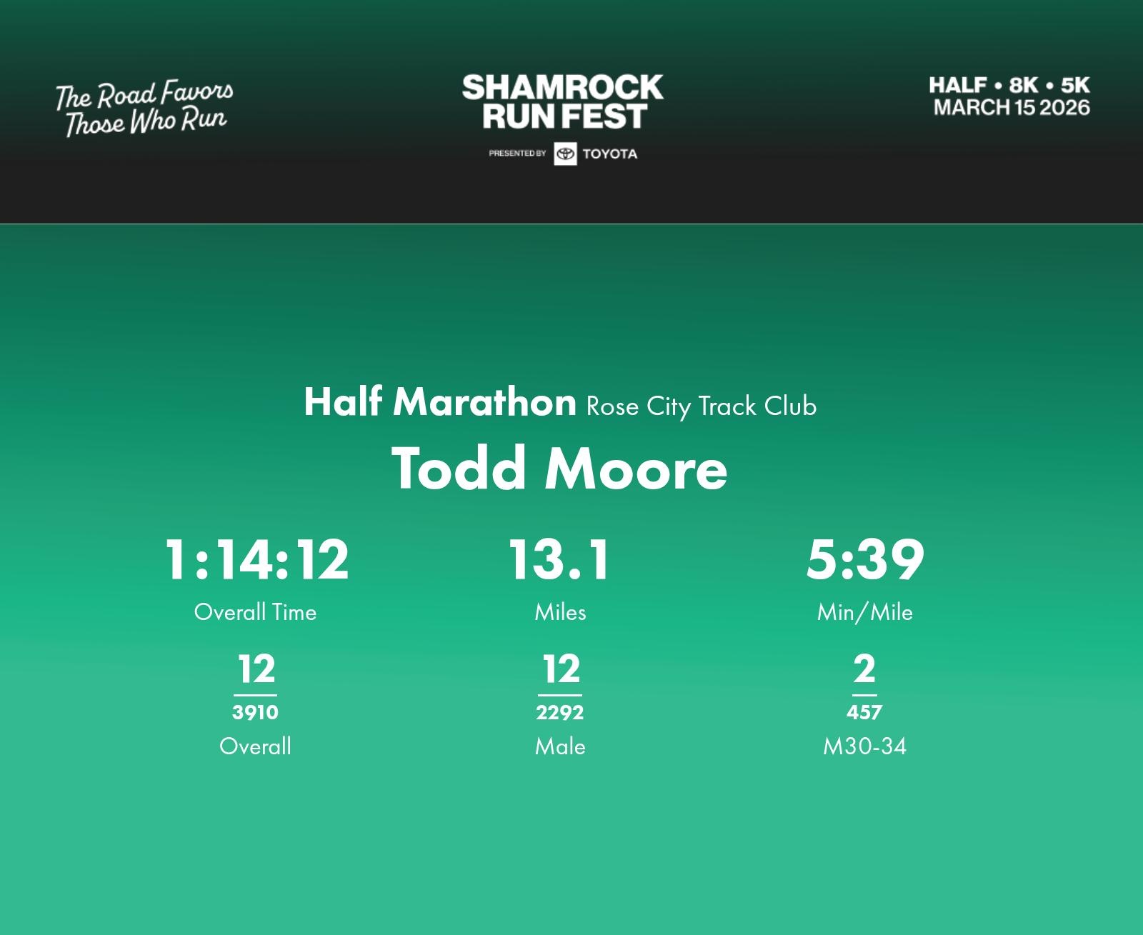 Strong Performance with Impressive Pacing and Top Division Placement Todd Moore clocked a notable 1:14:12 at the 2026 Shamrock Run Fest Half Marathon, finishing with an average pace of 5:39 min/mile. Throughout the race, Todd demonstrated consistent pacing and showcased resilience, especially noticeable during the closing miles. He excelled in the M30-34 division, securing a commendable 2nd place. His effort helped him maintain a steady performance, finishing 12th overall out of a competitive field of 4421 participants. Todd started strong, holding a top position early on. A highlight was his remarkable splits at Miles 10 and 13 with 5:18 and 5:02 min/mile paces. This burst of speed in the final stretch helped Todd advance his position in the division rankings. For future races, focusing on maintaining the mid-race pace could further enhance overall results. His participation representing the Rose City Track Club adds to the prestige of his performance.