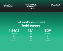 Date: March 15, 2026 Participant: Todd Moore #1476 Race: 2026 Shamrock Run Fest presented by Toyota Half Marathon Distance: 13.1 miles