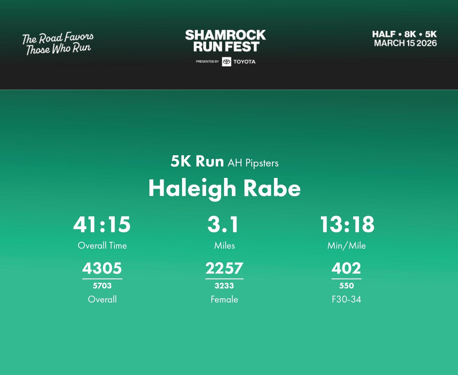 Date: March 15, 2026 Participant: Haleigh Rabe #40077 Race: 2026 Shamrock Run Fest presented by Toyota 5K Run Distance: 3.1 miles