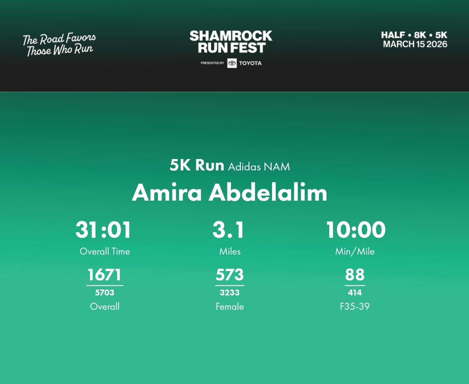 Date: March 15, 2026 Participant: Amira Abdelalim #40033 Race: 2026 Shamrock Run Fest presented by Toyota 5K Run Distance: 3.1 miles