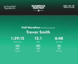 Date: March 15, 2026 Participant: Trevor Smith #1373 Race: 2026 Shamrock Run Fest presented by Toyota Half Marathon Distance: 13.1 miles