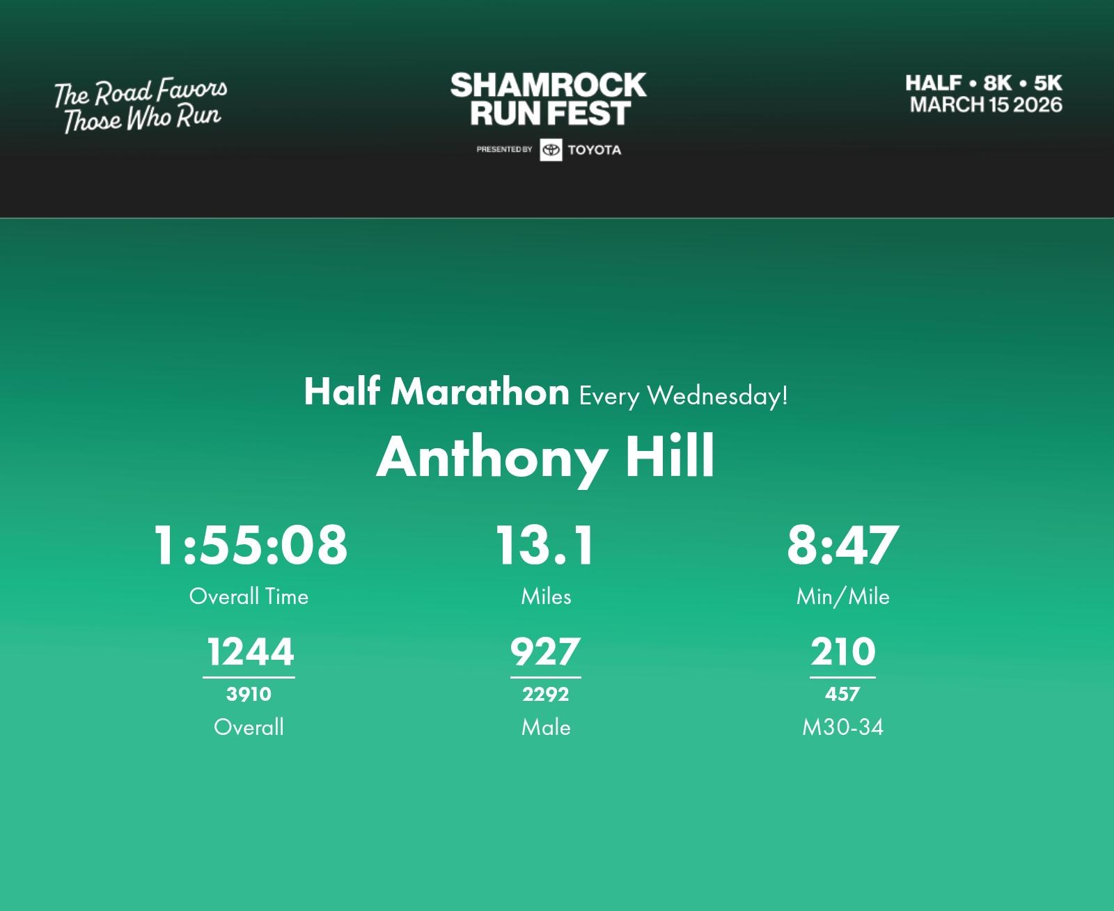 Date: March 15, 2026 Participant: Anthony Hill #1140 Race: 2026 Shamrock Run Fest presented by Toyota Half Marathon Distance: 13.1 miles