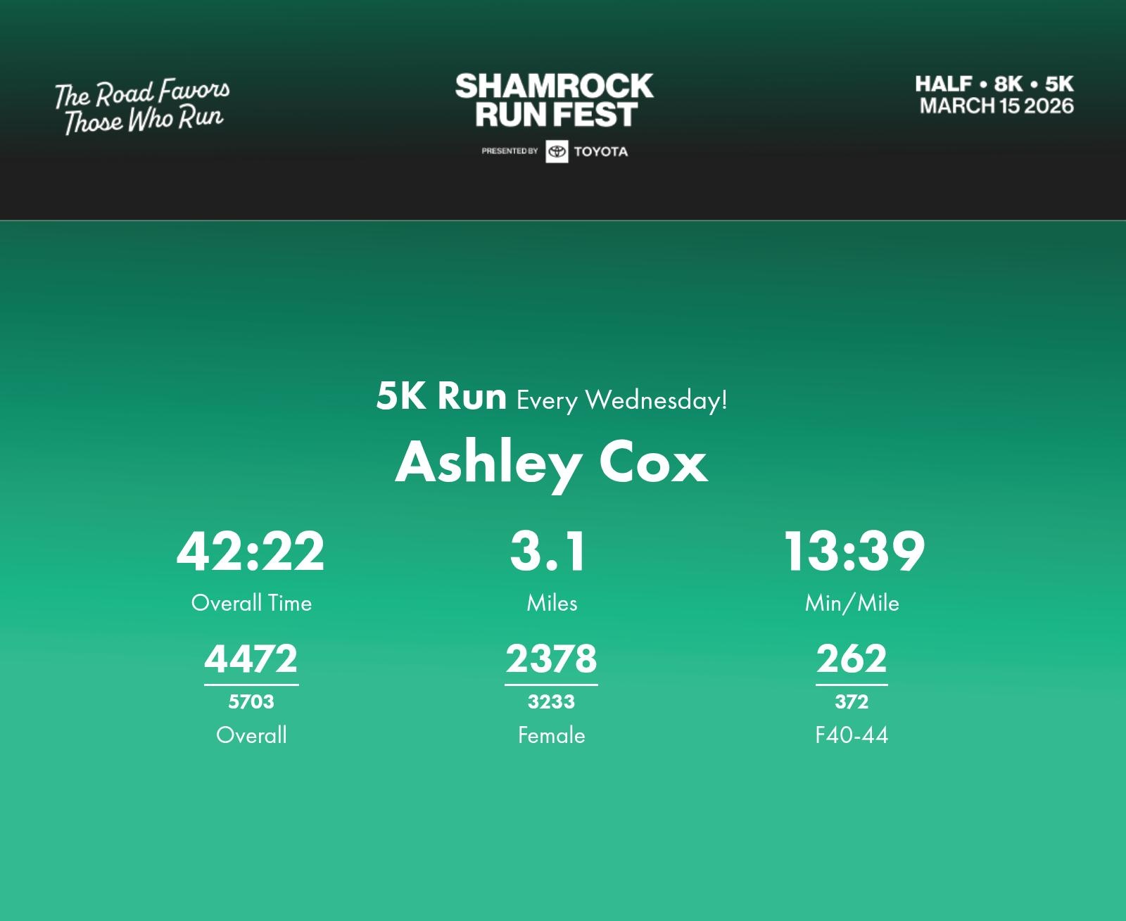 Date: March 15, 2026 Participant: Ashley Cox #40254 Race: 2026 Shamrock Run Fest presented by Toyota 5K Run Distance: 3.1 miles