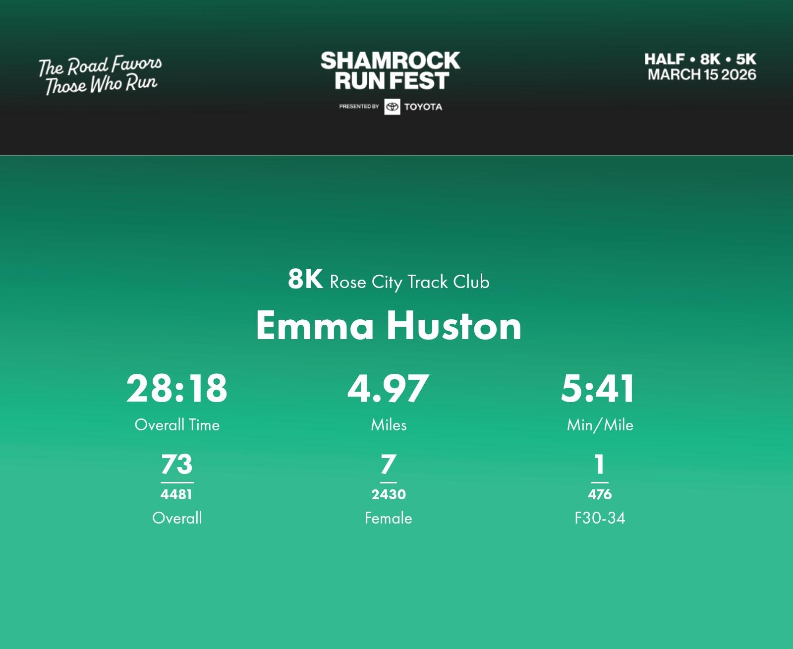 Date: March 15, 2026 Participant: Emma Huston #30562 Race: 2026 Shamrock Run Fest presented by Toyota 8K Distance: 5.0 miles