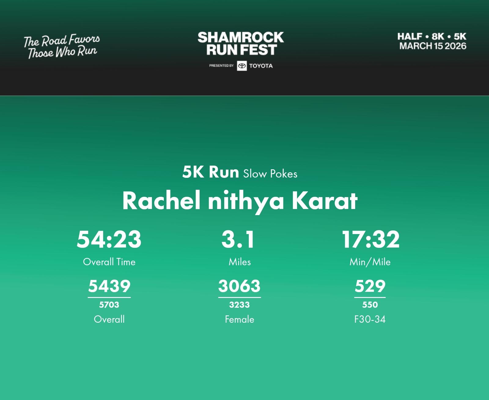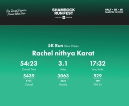 Date: March 15, 2026 Participant: Rachel nithya Karat #43293 Race: 2026 Shamrock Run Fest presented by Toyota 5K Run Distance: 3.1 miles