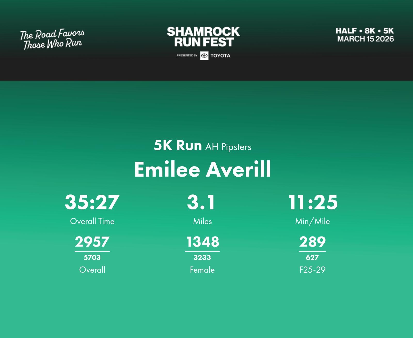Date: March 15, 2026 Participant: Emilee Averill #40068 Race: 2026 Shamrock Run Fest presented by Toyota 5K Run Distance: 3.1 miles