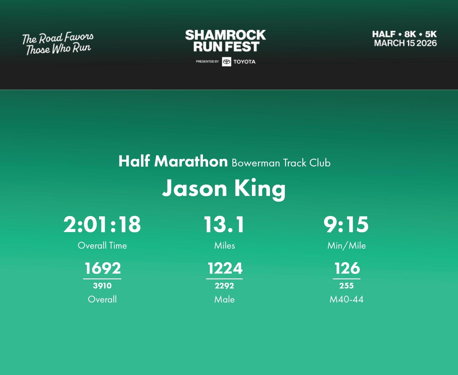 Date: March 15, 2026 Participant: Jason King #5284 Race: 2026 Shamrock Run Fest presented by Toyota Half Marathon Distance: 13.1 miles