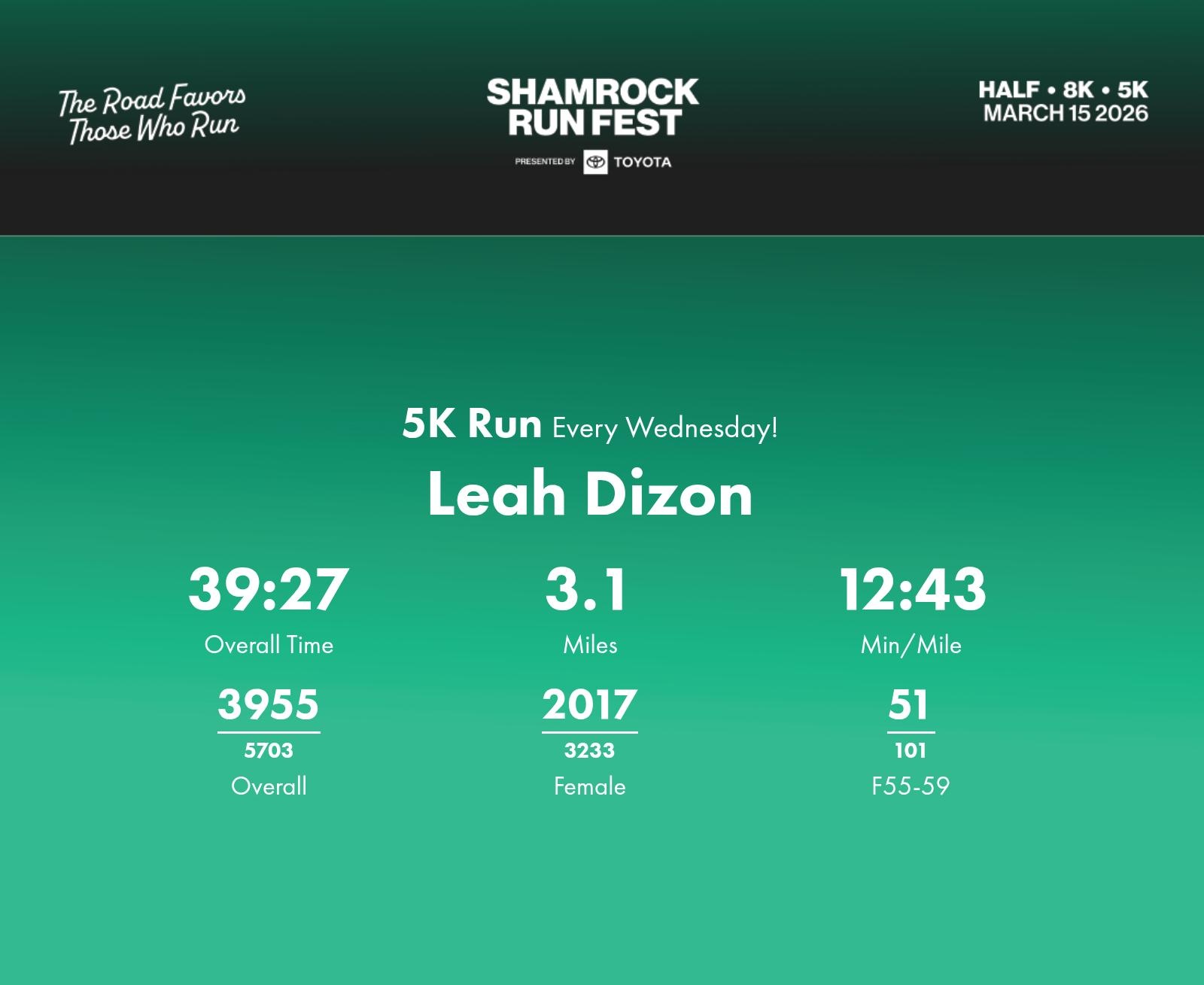 Date: March 15, 2026 Participant: Leah Dizon #40262 Race: 2026 Shamrock Run Fest presented by Toyota 5K Run Distance: 3.1 miles
