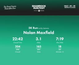 Date: March 15, 2026 Participant: Nolan Maxfield #43969 Race: 2026 Shamrock Run Fest presented by Toyota 5K Run Distance: 3.1 miles