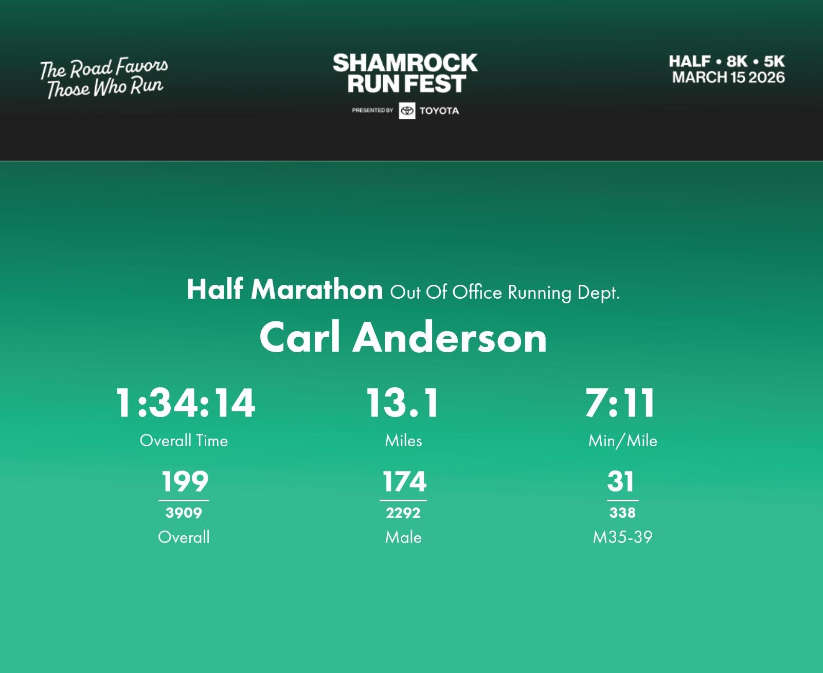 Date: March 15, 2026 Participant: Carl Anderson #1291 Race: 2026 Shamrock Run Fest presented by Toyota Half Marathon Distance: 13.1 miles