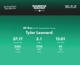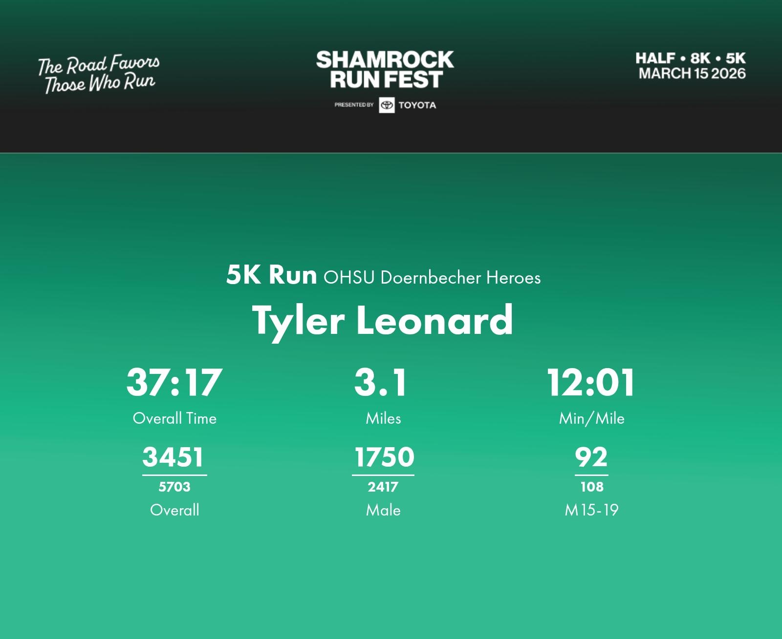 Date: March 15, 2026 Participant: Tyler Leonard #40409 Race: 2026 Shamrock Run Fest presented by Toyota 5K Run Distance: 3.1 miles