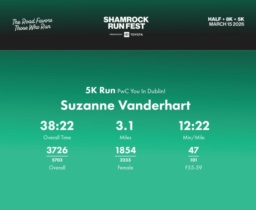 Date: March 15, 2026 Participant: Suzanne Vanderhart #43144 Race: 2026 Shamrock Run Fest presented by Toyota 5K Run Distance: 3.1 miles