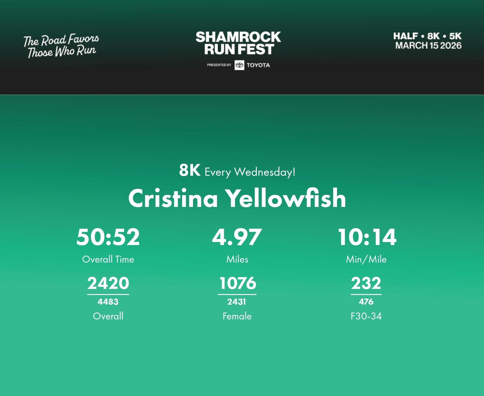Date: March 15, 2026 Participant: Cristina Yellowfish #30168 Race: 2026 Shamrock Run Fest presented by Toyota 8K Distance: 5.0 miles