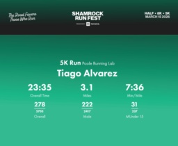 Date: March 15, 2026 Participant: Tiago Alvarez #40543 Race: 2026 Shamrock Run Fest presented by Toyota 5K Run Distance: 3.1 miles