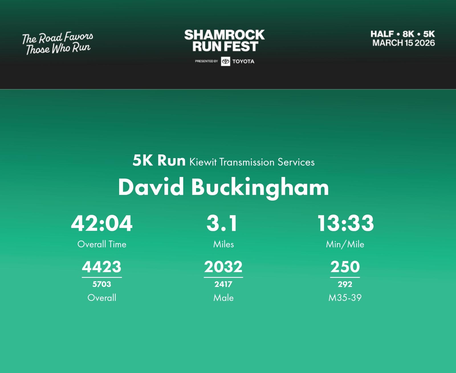 Date: March 15, 2026 Participant: David Buckingham #43786 Race: 2026 Shamrock Run Fest presented by Toyota 5K Run Distance: 3.1 miles