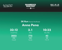 Date: March 15, 2026 Participant: Anna Pena #40190 Race: 2026 Shamrock Run Fest presented by Toyota 5K Run Distance: 3.1 miles